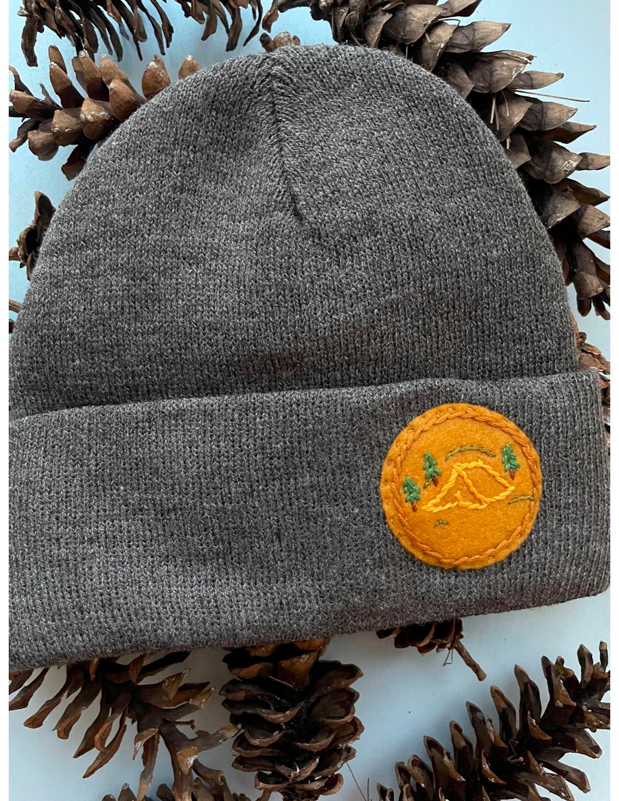 +Charcoal tuque with an ochre felt hand embroidered patch, featuring yellow tent, kelly green trees, sky blue mountains, fresh white snow.